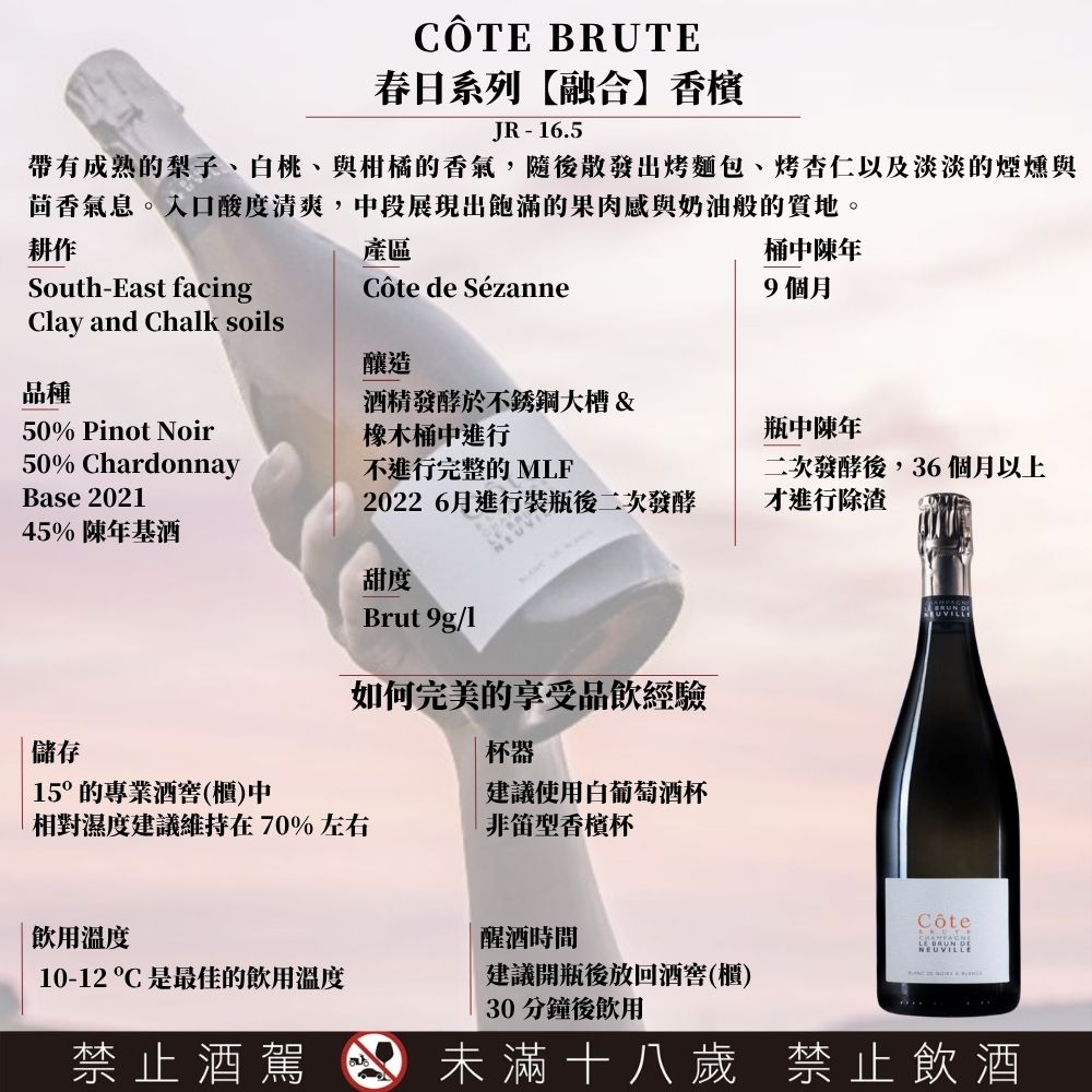 帶有成熟的梨子、白桃、與柑橘的香氣,隨後散發出烤麵包、烤杏仁以及淡淡的煙燻與茴香氣息。入口酸度清爽,中段展現出飽滿的果肉感與奶油般的質地。